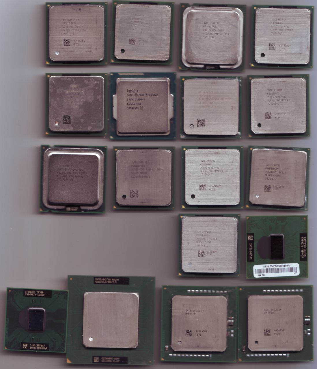 Listed from top-left: ------------------------ Intel Pentium 4 SL7E2 - Socket 478 3443B276 COSTA RICA 4446A456 0024 2.80GHz, 1MB L2 Cache, 533MHz FSB 2003 - Intel Pentium 4 SL7EB - Socket 478 7404A964 PHILIPPINES 6418A447 0518 2.40GHz, 1MB L2 Cache, 533MHz FSB 2003 - Intel Pentium 4 SL7Z9 - Socket 478 6632B389 CHINA 3.00GHz, 2MB L2 Cache, 800MHz FSB/04A 2004 - Intel Celeron SL6VY - Socket 478 7333a200 PHILIPPINES 6333c589 1110 2GHz, 128KB L2 Cache, 400MHz FSB 2002 - Intel Pentium 4 SL5TK - Socket 478 3143A166-0978 COSTA RICA 1.7GHz, 256Kb L2 Cache, 400MHz FSB, 1.75V 2001 - Intel Core i5-4570S SR14J - LGA 1150 COSTA RICA 3314B503 (e4) 2.90GHz, 1MB L2 Cache 2011 - Intel Pentium 4 SL6EF - Socket 478 L308A659-0203 MALAY 2.40GHz, 512Kb L2 Cache, 533MHz FSB, 1.525V 2001 - Intel Celeron SL6VY - Socket 478 7333A200 PHILIPPINES 6333C435 0759 2GHz, 128Kb L2 Cache, 400MHz FSB 2002 - Intel Core 2 Duo SLA4U - Socket 775 3751A274 COSTA RICA 3752A274 (e4) 6320 1.86GHz, 4MB L2 Cache, 1066MHz FSB, Stepping 06 2005 - Intel Pentium 4 SL6GS - Socket 478 L236A465-0013 MALAY 2.40GHz, 512Kb L2 Cache, 400MHz FSB, 1.525V 2001 - Intel Celeron SL6VY - Socket 478 7333A299 PHILIPPINES 6333C589 0520 2GHz, 128kB L2 Cache, 400MHz FSB 2002 - Intel Pentium 4 SL6PF - Socket 478 5425B527 CHINA 9433C548 0878 2.80GHz, 512Kb L2 Cache, 533MHz FSB 2001 - Intel Pentium 4 SL6WJ - Socket 478 5347A876 CHINA 9348B340 0144 2.80GHz, 512Kb L2 Cache, 80MHz FSB 2001 - Intel Pentium 4 SL7EN - Socket 478 Q439A102 RH80536 1800/2M 11S3BL5342ZJ1 W094 BB57J 1.80GHz, 2MB L2 Cache, 800MHz FSB 2003 - Intel Core 2 Duo T2300 Mobile SL8VR - Socket M LF80539 T2300 7604A974 1.66GHz, 2MB L2 Cache, 667MHz FSB 2004 - Intel Celeron SL68P - Socket 370 Q226A095-0219 MALAY 1.2GHz, 256Kb L2 Cache, 100MHz FSB, 1.5V 2001 - - Intel Xeon 4436 (NetBurst) SL7TE - Socket 603/604 3436A517-0200 COSTA RICA 4436A509 1171 3.4GHz, 1MB L2 Cache, 800MHz FSB 2004 - Intel Xeon 4436 (NetBurst) SL7TE - Socket 603/604 3436A517-0147 COSTA RICA 4436A509 0998 3.4GHz, 1MB L2 Cache, 800MHz FSB 2004