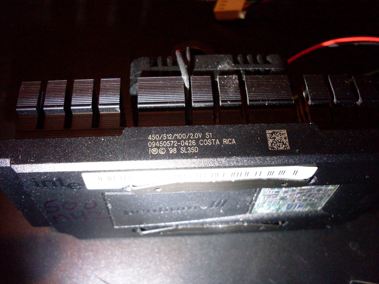 CPU Model = Intel Pentium III Slot 1 Frequency = 450 MHz L2 Cache = 512 KB Front-Side Bus = 100 MHz Core Voltage = 2.0 V Manufacturing = Costa Rica, Week 45, 1999 sSpec = SL35D Design Year = 1998